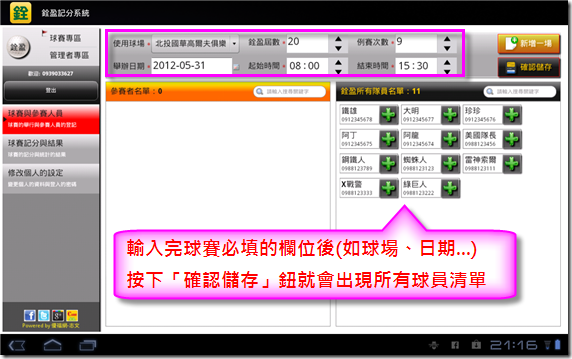 設定好比賽的球場、舉辦的日期、時間等資訊,按下「確認儲存」鈕後便會列出球隊所有球員